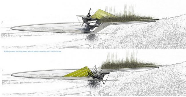 Основная идея заключается в том, что набирающий силу ураган сможет переместить дом вниз по опорному геликоиду (винтовой поверхности) за счет его парусообразных конструкций и гидравлических шарниров, что позволит ему зарыться в землю, защитив себя таким образом от неминуемых разрушений.