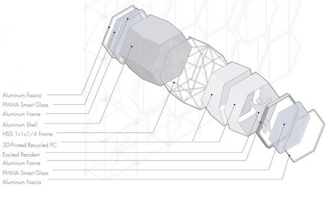 Жилая кабина Homed состоит из сборного наружного алюминиевого каркаса с достаточно надежной защитой от суровых городских условий, внутри которого размещены 3D-печатные поликарбонатные модули. Такое решение предоставляет возможность для интерьера поддерживать любые пространственные, функциональные и стилистические предпочтения, которые может иметь резидент. Каждая капсула оснащена интеллектуальным стеклом PMMA, которое обеспечивает заданную степень прозрачности.