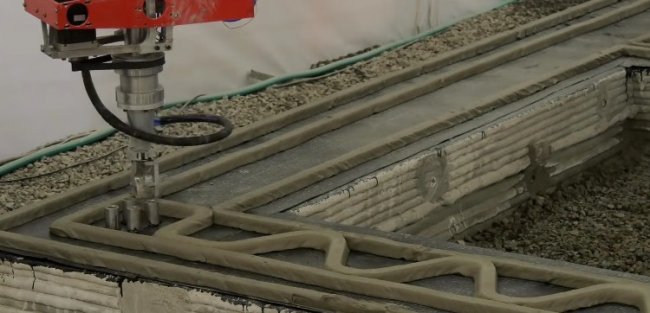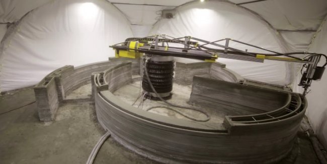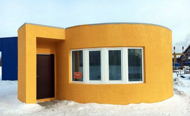 На испытательной площадке в российском городе Ступино (примерно 100 километров от Москвы) компактный дом был напечатан целиком, с несущими стенами и перегородками. Процессу создания сооружения не помешали даже отрицательные температуры. Для создания необходимых для застывания бетона условий, над площадкой просто натянули тент.