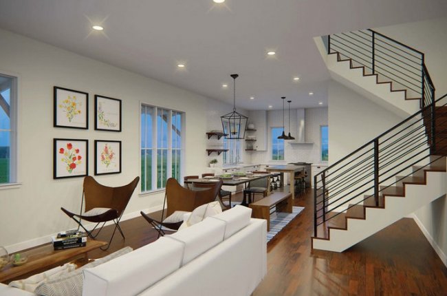 Внутреннюю отделку и интерьер «Солнечной фермы» дизайнеры назвали «Американской мечтой». В двухэтажном доме есть гостиная, объединённая с кухней и столовой, три спальни и две ванные. Его площадь составляет 190 квадратных метров. Планировка выполнена открытой, что способствует циркуляции воздуха. Трёхметровые потолки создают ощущение простора.