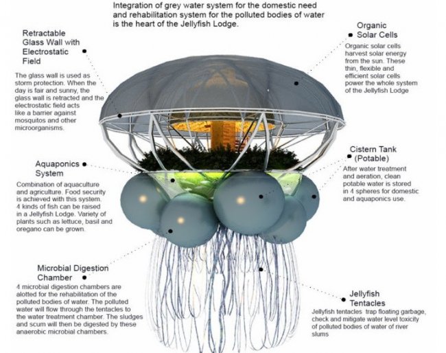 В аквапонных садах выращиваются пищевые продукты, также установка очищает воздух посредством электростатической системы. Проект будет стимулировать жителей близлежащих районов ухаживать за зелеными садами и собирать выращенные под "солнечными" куполами пищевые продукты. Jellyfish Lodge получил поощрительную премию на конкурсе Biodesign Competition в этом году.