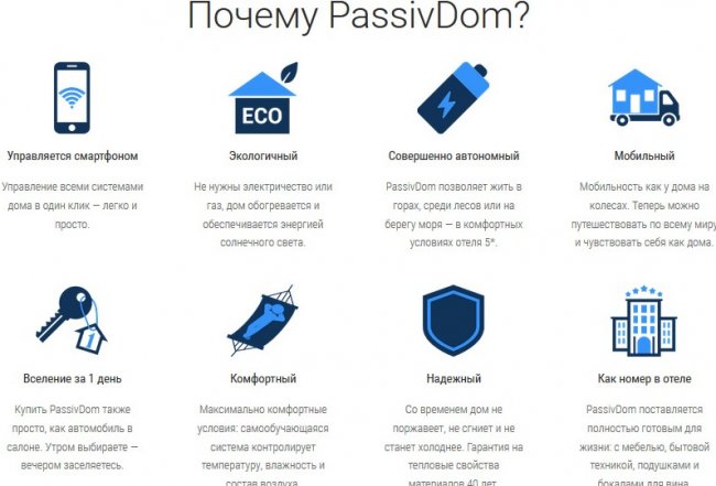 Технология PassivDom позволяет создавать энергоэффективные автономные дома, не нуждающиеся в электроэнергии и топливе даже в холодном климате. Дома используют только солнечную энергию и не загрязняют выбросами атмосферу. В автономной комплектации дом абсолютно независим от бытовых коммуникаций (линий электропередач, газопровода, водопровода и канализации).