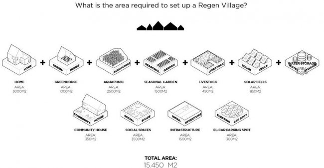В ReGen также подсчитали площадь земли, которой будет достаточно, чтобы обеспечить питание и проживание семьи из двух взрослых и одного ребенка. При традиционном фермерства на это уходит порядка 8100 м². В этом показателе – и площадь жилья, и сады, и огороды, и площадь фермы для животных, которых в течение года съедят эти люди, и площадь емкостей для хранения воды. В модели нового поселка на такую же семью тратится 639 м². Территория распределяется так: