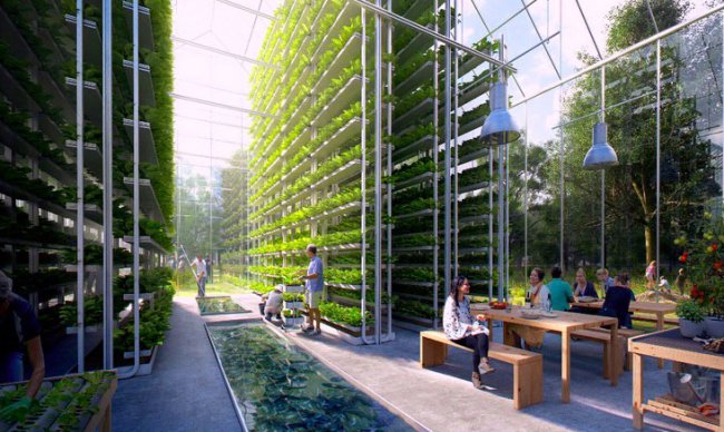 В предложенной ReGen модели экопоселения упор делается на гидропонику: вместо высадки растений в открытый грунт и привычного полива, их помещают в специальные контейнеры, где корни постоянно питает обогащенная питательными веществами вода. Это также позволяет высаживать растения на многоярусных стеллажах - создавать так называемые вертикальные фермы. Таким образом площади, необходимой для выращивания того же объема плодов, нужно в 50 раз меньше, чем в традиционном сельском хозяйстве. Воды используется на 90% меньше, а растут растения в десять раз быстрее. А учитывая то, что теплица будет в центре поселения, транспортные расходы приближаются к нулю.