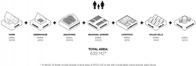 Дом - 120 м², теплицы - 40 м², комплекс с гидропоникой - 300 м², традиционный сезонный огород - 100 м², ферма - 25 м², солнечные панели - 34 м², хранилище пресной воды - 20 м².
