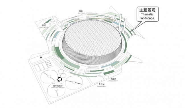 Гигантский мусороперерабатывающий завод будет представлять собой кольцевую структуру, включающую множество вспомогательных зданий и промышленных объектов. Подобная конструкция завода поспособствует эффективности работы его подразделений и минимизации углеродного следа. На территории экофабрики будут размещены установки по очистке сточных вод, общежитие и компрессорная станция.