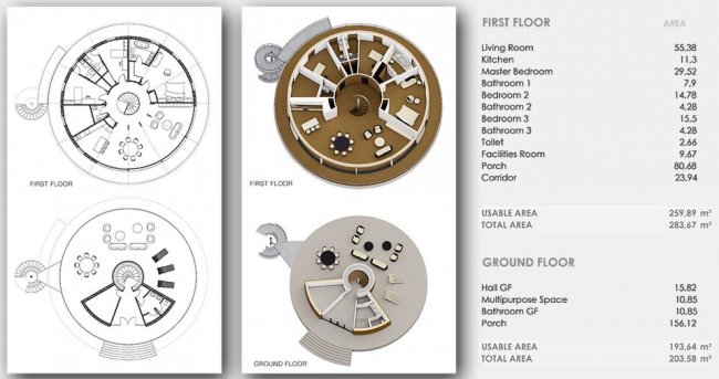 Каждый Sunhouse360º будет представлять собой здание в форме круга диаметром до 18,5 метров, установленного на плоской поверхности из армированного бетона. За движение дома будет отвечать высокотехнологичная система с приводом от двух электродвигателей и 15-минутным циклом вращения.
