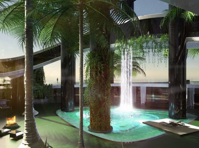 Пентхауз искусственного острова имеет джакузи со стеклянным дном, два лифта и возвышается на 80 метров, предлагая своим жильцам живописные морские пейзажи