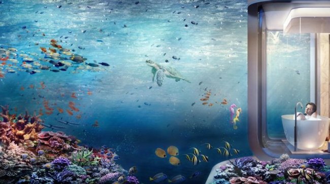 Каждый плавучий дом-корабль имеет три яруса – основной этаж на уровне моря, верхнюю палубу и нижний уровень, который полностью находится под водой. Подводный ярус включает в себя просторную спальню и ванную комнату. Панорамные окна которого, простирающиеся от потолка до пола открывают живописнейшие виды на коралловые рифы и их обитателей.