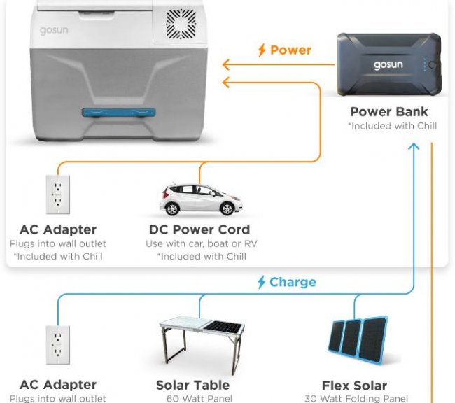 Однако GoSun Chill не привязан к фотоэлектрической системе – его компрессор можно запитывать напрямую через прилагаемый компанией Powerbank, любую розетку переменного тока на 100–240 В или стандартный 12-вольтовый автомобильный аккумулятор.