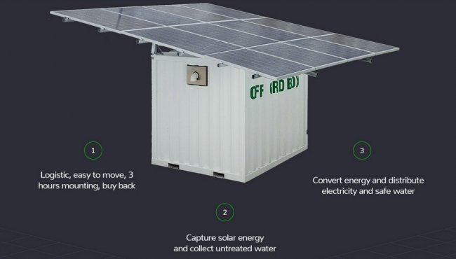 Контейнер OffGridBox способен вырабатывать 16 киловатт-часов электроэнергии, перерабатывая энергию солнечных лучей, и 24 тыс. литров отфильтрованной и стерилизованной воды. Как говорят разработчики, такого количества питьевой воды и электроэнергии достаточно для обеспечения потребностей деревни с населением до 300 человек.