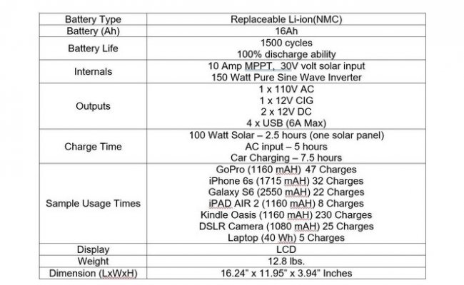 Предусмотрена также возможность увеличения мощности прибора до 120 Вт путем подключения дополнительных внешних солнечных панелей, что сокращает время зарядки. Аккумулятор можно заряжать и с помощью электросети или от розетки в автомобиле с напряжением 12V. Небольшой ЖК-экран отображает текущий уровень батареи, а также производительность, светодиод обеспечивает освещение на уровне среднего фонарика. Аккумуляторную батарею 14.8V, которая рассчитана на 1500 циклов зарядки, по истечении срока полезного использования можно заменить.