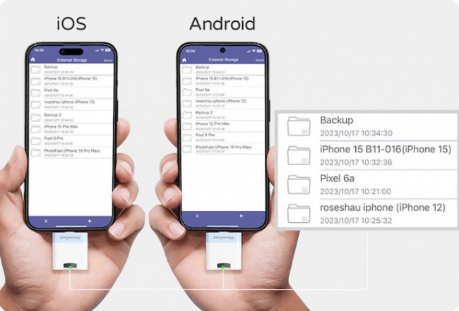 Устройство компактно и представляет собой модуль, подключаемый через интерфейс USB-C. В нем имеется слот для установки карты памяти объемом до 2 Тб. На сменный накопитель можно сделать резервные копии данных с нескольких устройств. При этом файлы с каждого гаджета будут сохранены в отдельные папки. Устройство совместимо с телефонами и планшетами на IOS и Android и обеспечивает высокую скорость копирования.