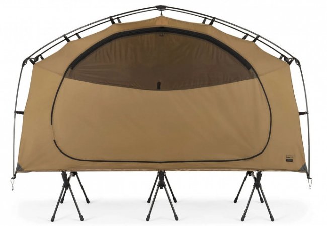 Серьезным преимуществом палаток Helinox перед конкурентами является прочность и надежность армейского уровня. Производитель предлагает не полные комплекты, а скорее дополнительную тканевую защиту для существующих кушеток-раскладушек Helinox. Самой простой и интересной в линейке стала мини-палатка, рассчитанная на 1 человека, имеющая широкие двери по бокам. В собранном виде палатка имеет размеры 57 х 20 х 20 см, а ее вес составляет всего 1,8 килограмма.