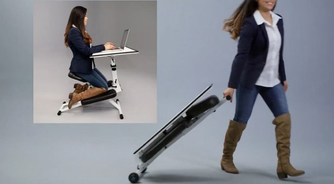 Идея в том, чтобы носить или возить рабочее место вместе с собой на подставке с колесиками. Это установка под ноутбук или графический планшет — или вообще любое легкое и плоское устройство. К ней прилагается сидение, но нестандартное – с упором коленями на специальные подложки. Такой способ размещения используется во многих эргономичных стульях и помогает снизить нагрузку на опорно-двигательный аппарат.