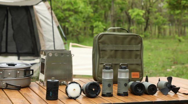 За счет магнита фонарь можно надежно закрепить на металлических поверхностях. Также магнит выступает в качестве крепления дополнительных модулей, в числе которых регулируемый и нерегулируемый прожекторы, способные проработать до 2,8 часа. Кроме того, в набор включены вентилятор с безопасными резиновыми лопастями и воздушный насос с тремя переходниками для накачивания различного туристического снаряжения.