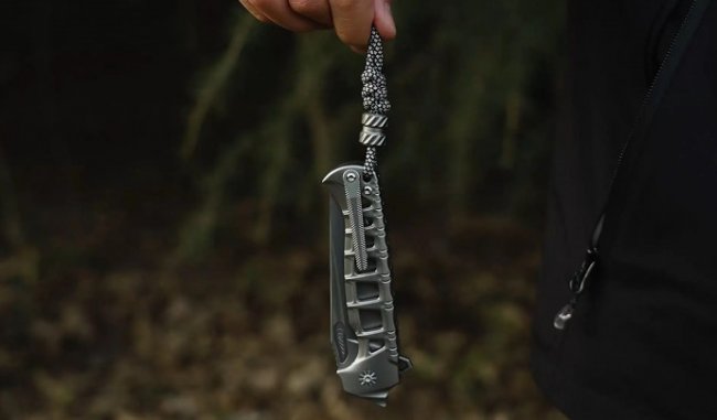 Нож весит всего 143 грамма, а его дизайн напоминает скелет дракона. Лезвие плавно поворачивается на роликовых подшипниках и надежно фиксируется. На ручке присутствуют клипса для ношения на поясе и отверстие для шнурка.