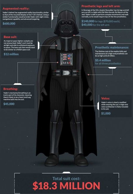 К этому списку придется добавить систему дыхания стоимостью 45000 и звуковой синтезатор в 1000 долларов. Итого, сегодня Дарту Вейдеру его чудо-одеяние обошлось бы в 18,3 млн. долларов.