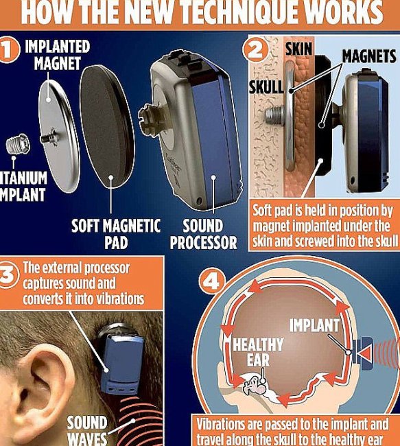Слуховой аппарат, подключённый к черепу и передающий звуковые колебания через кости, может стать идеальным решением для больных, страдающих односторонней глухотой.