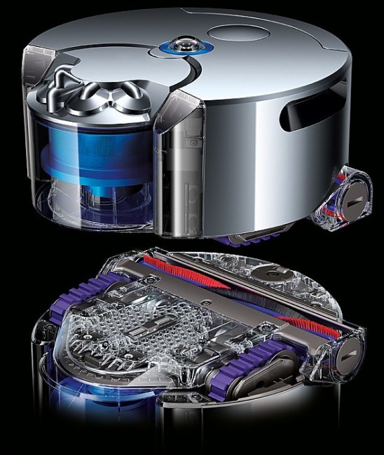 Гордость Dyson Vacuum 360 Eye – камера кругового обзора, расположенная в верхней части. С ее помощью производится видеосъемка под углом 45 градусов и составляется карта помещения. Далее робот-пылесос определяет свое местоположение, находит центр комнаты и приступает к уборке, двигаясь по спирали. Освободив от пыли площадь в 10 кв. футов, он переходит на новый участок. «Сердце» устройства – современный двигатель с цифровым управлением. Передвижение – на гусеничном ходу.