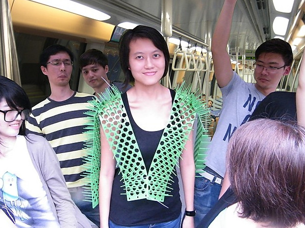 Промышленный дизайнер Сью Минг Ченг из Сингапура представил жилет Spike Away для поездок в общественном транспорте. Он состоит из нескольких сотен шипов, изготовленных из прочного пластика. В таком жилете внимание общественности вам обеспечено, впрочем, как и личное пространство, в которое вряд ли кто захочет вторгнуться.