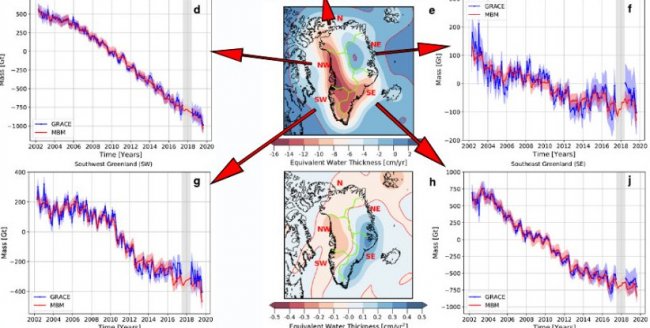 В новой работе ученые проанализировали спутниковые снимки и метеорологические данные на предмет летних изменений в ледяном покрове Гренландии. Исследование показало, что в 2019 году ледяной щит Гренландии потерял 600 млрд т льда.