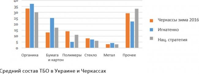 Полученные результаты свидетельствуют о том, что 26% всех ТБО в Черкассах– это органика, 14% полимеры, 8% стекло, бумага и картон 7% и 6% соответственно. Как видно на графике ниже, полученные данные несколько отличаются от оценок среднего состава ТБО по Украине, которые предлагаются экспертами и Национальной стратегией устойчивого развития.