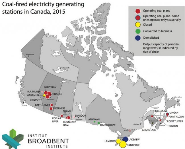 Карта работающих и закрытых угольных электростанций в Канаде на 2015 год. Источник: The Broadbent Institute