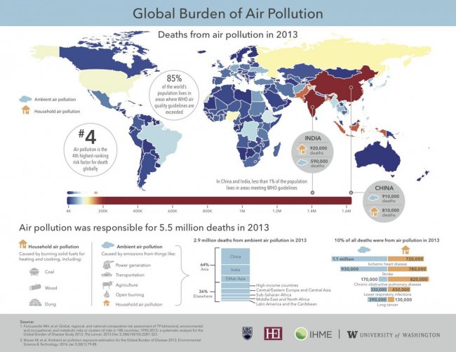 Новое исследование показывает, что более 5,5 миллиона человек ежегодно преждевременно умирают из-за загрязнения атмосферного воздуха. Более половины случаев смерти происходит в двух из самых быстрорастущих экономик мира – Китае и Индии.