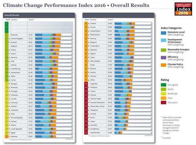 Украина опустилась на 46 место в Индексе противодействия изменениям климата (2016), в то время, как год назад страна занимала 30 место в этом рейтинге. Информация об этом сообщается в последнем исследовании немецкой организации Germanwatch, которое было продемострировано на пресс-конференции в рамках климатического саммита ООН в Париже.