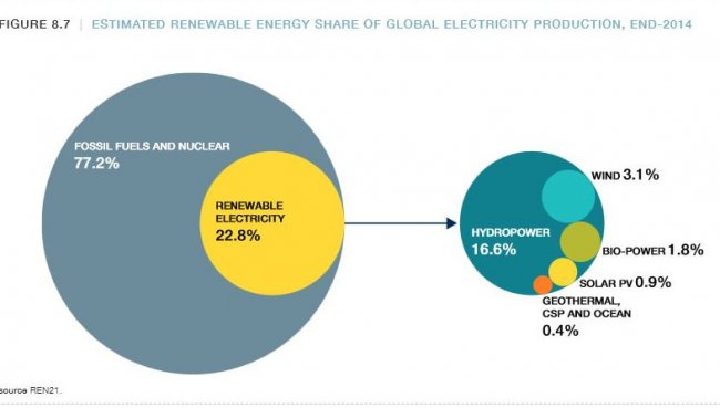 Также в докладе отмечается, что в течение 15 лет мировая доля ВИЭ в электроэнергетике (с учетом крупных ГЭС) может утроиться — с 21% до 64%. Такой ход событий реален даже учитывая бурное развитие экономик Бразилии, Китая и Индии. При этом антропогенные выбросы CO2 в энергетическом секторе к 2030 году могут упасть с нынешних 30-ти гигатонн до 20-ти гигатонн в год.