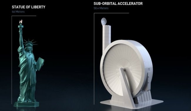 Реализовать свой амбициозный проект SpinLaunch планирует с помощью суборбитального ускорителя. Он состоит из вакуумной камеры в виде установленного вертикально сплюснутого цилиндра, которая немного выше статуи Свободы (46 м). В ней используется трос из углеродного волокна, разгоняющий снаряд до скорости 8047 км/ч ( в 6,5 раз больше скорости звука) и высвобождающий его через пусковую трубу в атмосферу.