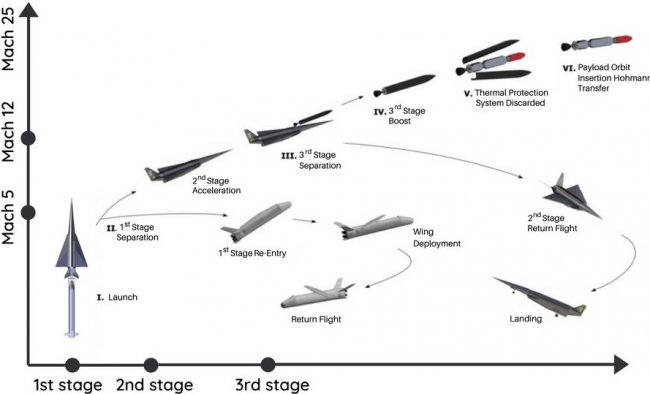 В теории эта трехступенчатая система будет работать следующим образом: Delta-Velos взлетает с помощью ракеты-носителя Boomerang, которая выполняет две задачи: разгоняет самолет до скорости 5 Махов и после отсоединения благополучно приземляется, как например возвращаемые ступени ракет SpaceX. Следующий этап начинается с запуска гиперзвукового прямоточного воздушно-реактивного двигателя Spartan, который разгонит Delta-Velos с 5 до 12 Махов. Эта скорость позволит ему взлететь достаточно высоко, чтобы перейти к заключительному этапу, т.е. запуску спутников, тем самым помещая их на низкую околоземную или гелиосинхронную орбиту.