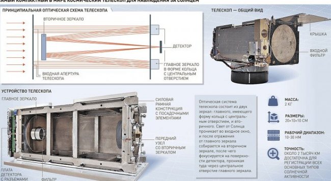 Телескоп СОЛ позволит специалистам наблюдать практически за всеми вспышками, возникающими на Солнце, за счет того, что он оснащен специальным комплектом оптики, имеющим металлическое покрытие из нескольких слоев, отражающее даже самый жесткий УФ при длинах волн порядка 10-30 нм, а также два тонкопленочных фильтра.