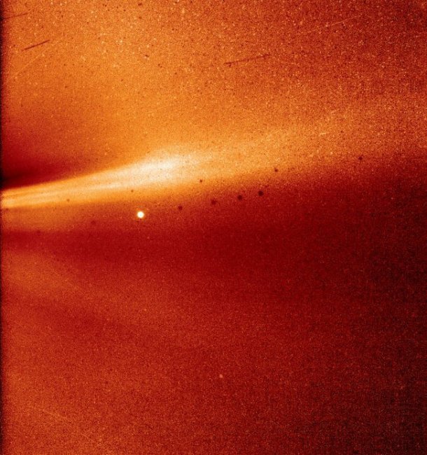 Яркая белая точка в центре снимка – это Меркурий, а расположенные рядом темные точки – фоновые помехи.