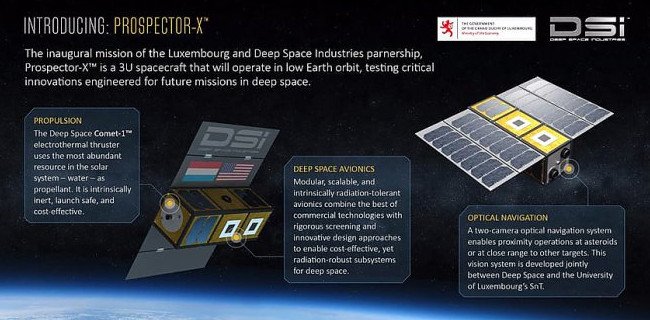 Сборка Prospector-X пройдет в европейском подразделении Deep Space, расположенном в Люксембурге. Сам спутник состоит из трех кубических модулей и набора солнечных панелей. В число оборудования войдут навигационная система с двумя камерами, электротермические двигатели на жидком топливе и исследовательская аппаратура.