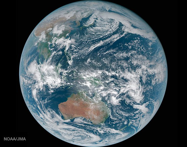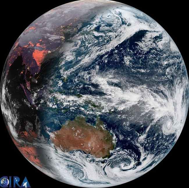 Японский метеоспутник «Химавари-8», находящийся на геостационарной орбите над Тихим океаном на высоте 35400 км, передал на Землю уникальные снимки. Естественная цветовая гамма снимков стала возможна, благодаря новому методу обработки SHCS (Simple Hybrid Contrast Stretch), который был разработан в