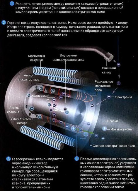 В образовавшееся поле подаётся ксенон, где он теряет свои электроны, которые затем превращаются в положительные ионы. Эти частицы под действием тока устремляются в магнитное поле, распределенное вдоль оси двигателя. В нем они разгоняются и выбрасываются из сопла со скоростью 72420 км/ч.