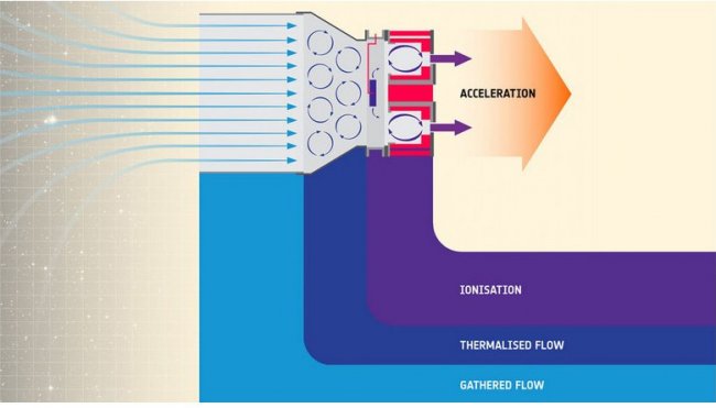 Процесс представляет собой «всасывание» топлива (по факту, воздуха) через специальные сопла, где молекулы сжимаются настолько, что превращаются в ионизованную плазму. Отдавая свой электрический заряд, они создают тягу.