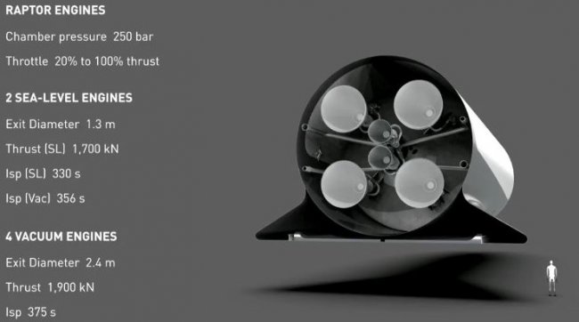 При полетах на Марс BFR сможет перевозить около 100 человек, размещаемых в 40 каютах. Максимальная грузоподъемность нового корабля составит 150 тонн, масса – 85 тонн, а его баки будут вмещать 1100 тонн ракетного топлива. Общая высота ракеты составит 106 метров, грузового модуля – 48 метров, диаметр – 9 метров. В движение ее будут приводить 31 метановых двигателя Raptor суммарной тягой в 5400 тонн.