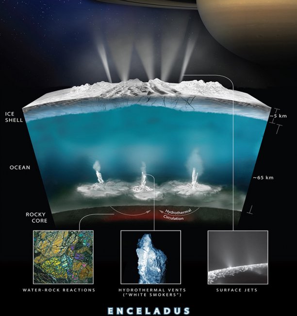 С момента открытия учеными гейзеров на Энцеладе в 2005 году, впервые зонд Кассини смог обнаружить в них какие-либо признаки возможной жизни. Считается, что движения воды происходят из-за гидротермальной активности в ядре спутника, а его гейзеры, как оценивается, в 2,5 раза мощнее любого горячего источника на Земле. Несмотря на ледяную внешнюю оболочку, гравитационное притяжение Сатурна создает тепло, согревающее воду внутри спутника, что также является благоприятным фактором для развития жизни.