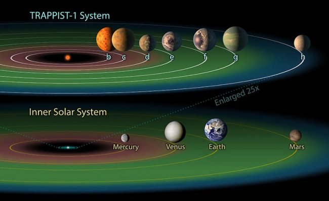 С помощью космического телескопа «Спитцер» исследователи НАСА впервые обнаружили систему из семи землепододобных планет, вращающихся вокруг одной карликовой звезды. Как минимум три планеты из них расположены в обитаемой зоне, подразумевающей возможность наличия воды в жидком состоянии.