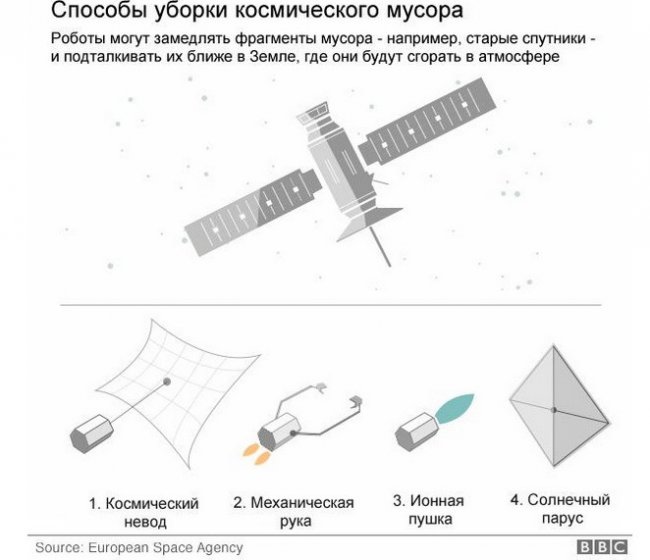 Японский мусоросборщик стал последним в череде выдвинутых предложений, которые включали - среди прочего – нанизывания мусора на гарпун, "подметание", ловлю с помощью лассо или сталкивание мусора с орбиты в сторону Земли.