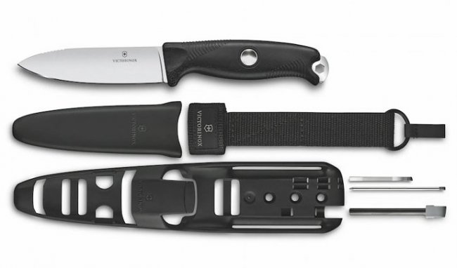 Официальный поставщик швейцарской армии компания Victorinox представила новую модель ножа-мультитула Venture Pro, которую отличает наличие фиксированного лезвия. Здесь нет выдвижных или складных частей, а сам нож является цельным изделием, которым можно как резать, так и рубить, строгать и выполнять прочие действия, необходимые для выживания. Все хитрости перенесены в ножны и систему крепления.
