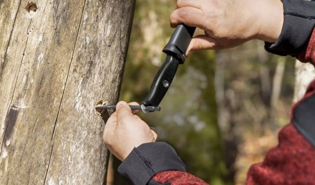 На рукоятке ножа есть шестигранное отверстие для выкручивания болтов, крепежа веревки или установки туда сверла. С его помощью можно не только делать отверстия, но и попробовать разжечь огонь методом трения. Ножны в этом случае выступают в качестве ручки, а когда огонь начнет разгораться, с их помощью можно его раздуть.