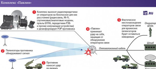 Речь идет о комплексе «Павлин», благодаря которому принимающие и передающие устройства можно разнести на любое расстояние от операторов, в связи с чем устраняется угроза нанесения по ним удара. Комплекс предназначен для работы с различными средствами связи, блоками управления беспилотниками и другой подобной аппаратурой, которую можно запеленговать.