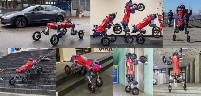 Компания Swiss Mile разработала необычного робота ANYmal. Внешне он выглядит как робособака, но при этом не ходит, а ездит, опираясь на четыре колеса. В режиме «гуманоида» он может вставать на задние ноги, при этом колеса используются для самобалансировки. Переднюю пару опор с колесами робот весьма успешно использует в качестве рук.