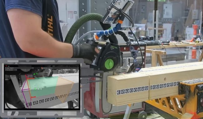 Новый проект Augmented Carpentry, разработанный Андреа Сеттими и его коллегами из Швейцарского федерального технологического института в Лозанне (EPFL) предлагает технологию выполнения сложных столярных работ с высокой скоростью за счет дополненной реальности. Новая система использует планшет, который крепится на электроинструменте плотника. Пользователь сканирует камерой планшета каждый кусок дерева, маркируя его специальными стикерами для идентификации в трехмерном пространстве.