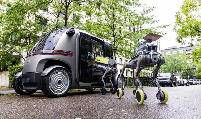 На основе ANYmal был создан грузовой робот RIVR ONE. От предшественника он получил комбинированное шасси – робот может ездить на колесах или заблокировать их и использовать как опоры. В этом состоянии он может подниматься по лестницам, перешагивать через препятствия, перемещаться по сложному рельефу. Это дает ему преимущество перед простыми колесными роботами-курьерами.