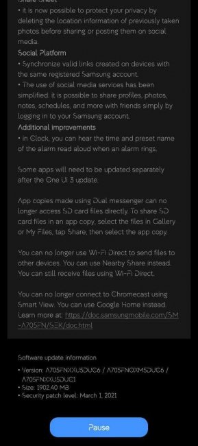 В первую очередь, владельцы Galaxy A70 получат кардинально измененный интерфейс, так как до этого смартфон работал с оболочкой One UI 2.5. Кроме того, добавлен патч безопасности за март. Он устраняет несколько уязвимостей, затрагивающих чипсет Exynos 990 (хотя это, очевидно, не касается владельцев Galaxy A70), а также другие уязвимости, обнаруженные в собственном программном обеспечении Google.